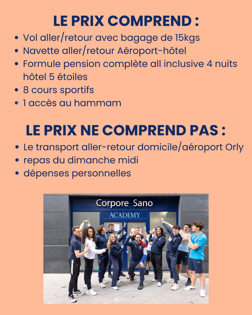 Tous les cours sportifs seront encadrés par nos enseignants de Corpore Sano Academy, garantissant un accompagnement professionnel et personnalisé pour chaque participant.